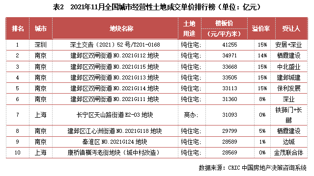 2021年11月處于二、三輪集中土拍的交接期,月內共有深圳、無錫等6個重點城市拍地。
