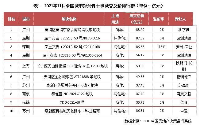 11月,正值二輪土拍收官、三輪土拍開始之際,寧波、鄭州完成了第二輪集中土拍,深圳、南京、蘇州和無錫等4個城市年末最后一輪集中土拍也順利收官。因此,本月成交總價TOP10地塊也來自這些重點城市。其中,摘得總價榜榜首的地塊為廣州黃埔老城區一宗商辦地塊,成交總價為88.4億元,由科學城競得;門檻地塊則來自蘇州,由中建以36.31億元的底價競得。