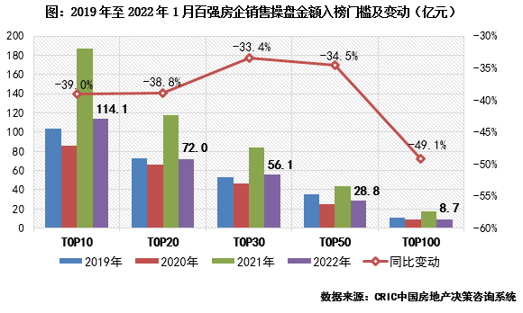 2022年1月,百強房企各梯隊銷售門檻較去年同期顯著降低。其中,TOP10和TOP20房企銷售操盤金額門檻分別為114.1億元和72億元,同比降低39%和38.8%。TOP30和TOP50房企的銷售操盤金額門檻也分別同比降低34%左右,門檻值僅略高于2020年同期。而TOP100房企的銷售操盤金額門檻同比降幅最高達49.1%,8.7億元的門檻值也處在近年來的最低水平。