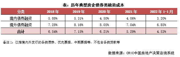 融資成本:2022年1月100家典型房企新增債券類1融資成本4.53%,較2021年全年下降下降0.76pct,其中境外債券融資成本達6.85%,下降0.19pct,境內債券融資成本3.20%,下降0.87 pct。環比2021年12月來看,總融資成本環比上升0.01pct,境外融資成本環比下降0.16pct,境內融資成本環比下降0.53pct。境內發債的企業中,可以進行發債的企業成本相對較低,融資利率在2.50%-4.00%間,白名單企業繼續發揮融資優勢,繼續發行利率較低的債券;境外發債成本方面,旭輝、遠洋等發行了綠色擔保票據,其成本不超過5%,也相對較低,還有部分企業完成了境外債的交換要約和額外發行,成本相對較高。