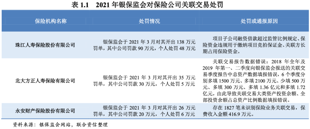 近年來,保險機(jī)構(gòu)資金運(yùn)用關(guān)聯(lián)交易違規(guī)事件時有發(fā)生,且隱蔽性及復(fù)雜性均有所加劇,2021年以來,銀保監(jiān)會持續(xù)加強(qiáng)保險機(jī)構(gòu)關(guān)聯(lián)交易監(jiān)管工作,并對違規(guī)主體進(jìn)行一定的處罰與通報。2021年,銀保監(jiān)會網(wǎng)站披露珠江人壽保險股份有限公司、北大方正人壽保險有限公司以及永安財產(chǎn)保險股份有限公司行政處罰決定書(見表1.1);2022年4月,銀保監(jiān)會下發(fā)了《關(guān)于銀行保險機(jī)構(gòu)股權(quán)和關(guān)聯(lián)交易監(jiān)管信息系統(tǒng)數(shù)據(jù)質(zhì)量突出問題的通報》(以下簡稱“《通報》”),《通報》指出,銀行業(yè)保險業(yè)關(guān)聯(lián)交易監(jiān)管系統(tǒng)于2020年9月上線運(yùn)行,其中4家保險機(jī)構(gòu)因數(shù)據(jù)報送不及時或數(shù)據(jù)填報不準(zhǔn)確遭點(diǎn)名。
