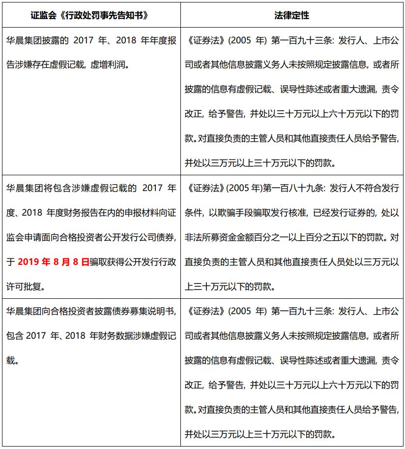 2021年4月20日, 中國證監會因華晨集團涉嫌信息披露違法違規對其進行立案調查一事已有定論: 相較于上交所和遼寧證監局出具的監管函認定的“債券存續期間未及時履行信息披露義務”, 證監會在《行政處罰事先告知書》(處罰字[2021]24號)中重拳出擊, 新增認定華晨集團涉嫌“四宗”證券虛假陳述行為, 擬對華晨集團處以5360萬元罰款。