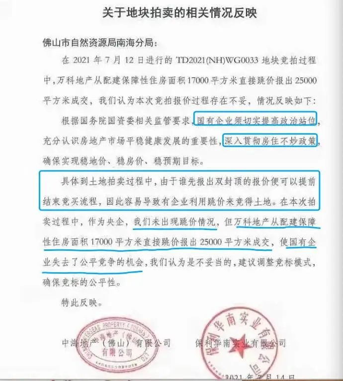 大概是覺得萬科太不講武德了,事后,中海和保利越想越氣,7月14日,他們聯合起來,給佛山市自然資源局南海分局寫了一份信,反映這樣的報價過程存在不妥。
