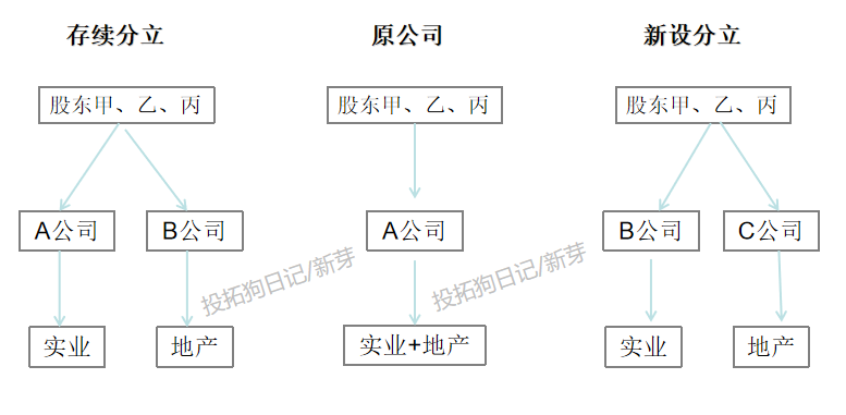 首先,先簡單的說明一下,分立包含兩種形式,存續分立和新設分立。(由于地產實操中,基本上都是采用存續分立,因此下文只講存續分立)