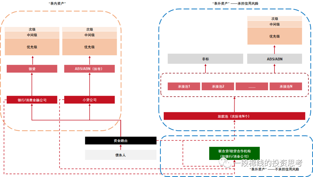 1)零售信貸行業完整的“資產負債表”應該囊括所有實際承擔信用風險、賺取超額收益的資產及負債(應并入實際抽走超額收益并隱含承擔還款義務的金融產品);