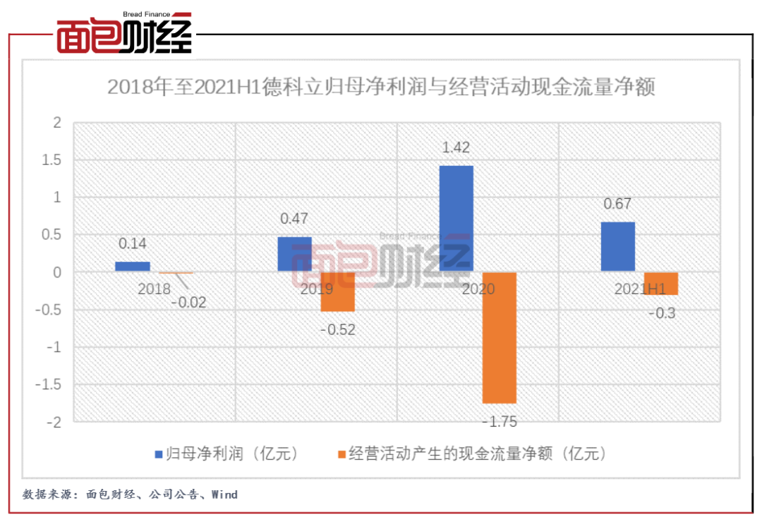 德科立近年來經營活動產生的現金流量一直為凈流出狀態。2019年至2021年上半年,公司經營活動產生的現金流量凈額分別為-0.52億元、-1.75億元、-0.3億元。