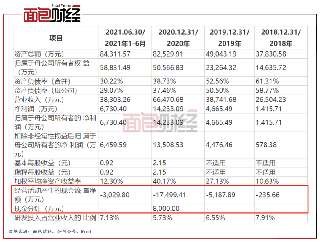 公司經營活動產生的現金流量凈流出與應收賬款和存貨的增加有關。2020年公司應收賬款為1.34億元,較上年末增加逾80%,2021年上半年末進一步增至2.25億元;存貨賬面價值為3.03億元,較上年末增加逾110%。