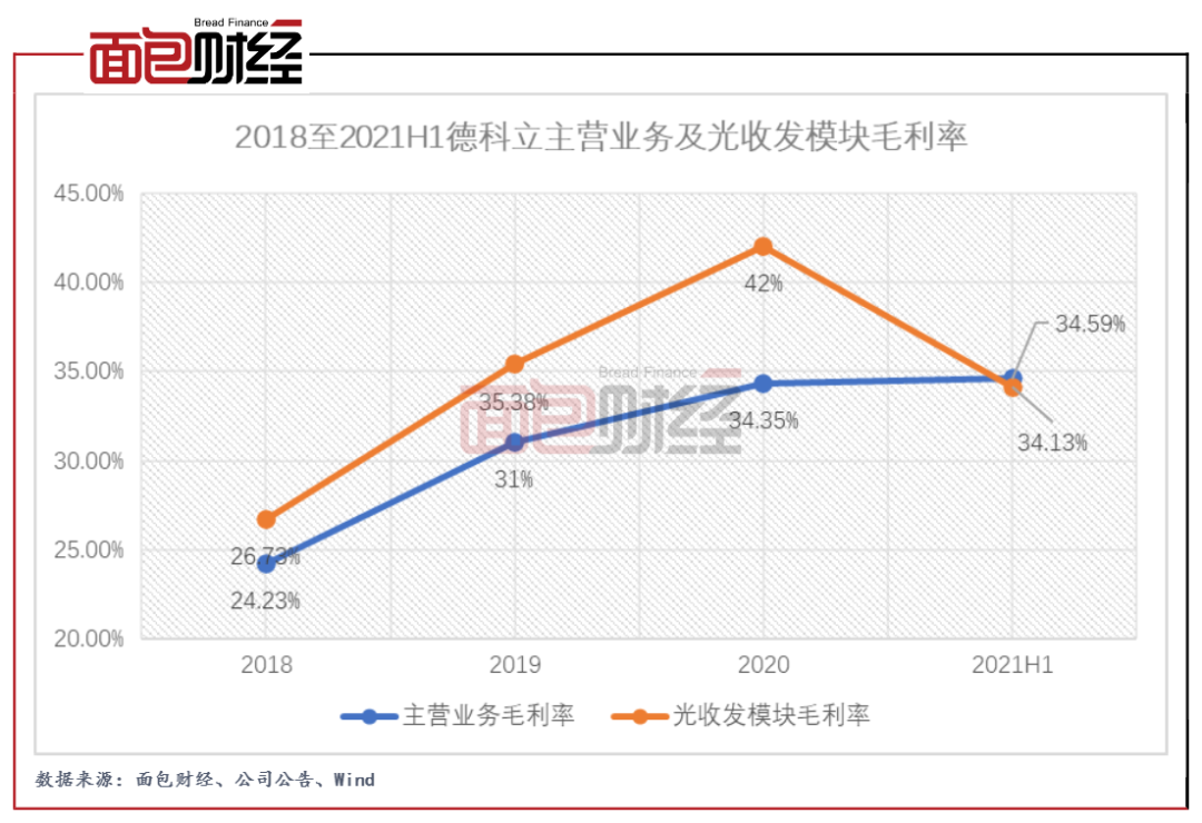 2018年至2020年,德科立主營業務毛利率分別為24.23%、31.00%、34.35%,呈現上升趨勢。