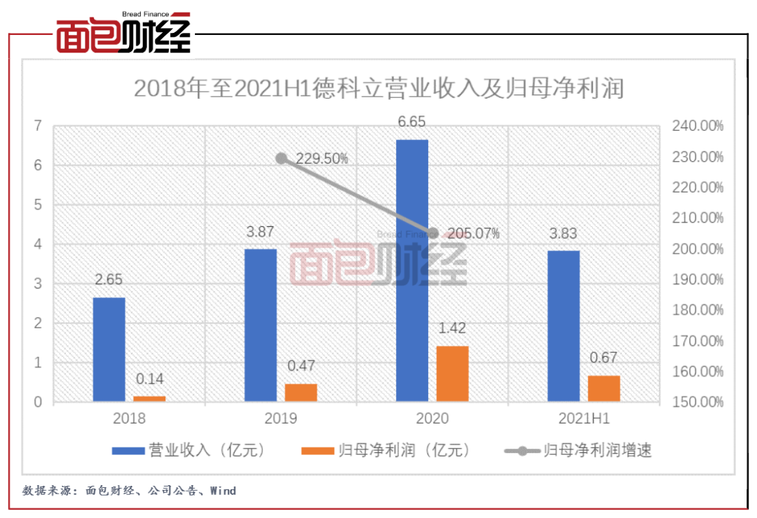 2019年和2020年德科立實現營業收入分別為3.87億元、6.65億元,同比分別增長46.17%、71.57%;實現歸母凈利潤分別為0.47億元、1.42億元,同比均增長2倍以上。2021上半年,公司實現營業收入3.83億元;實現歸母凈利潤6730.4萬元。