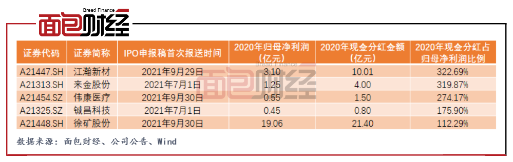 不僅僅是德科立,擬上市前的高比例分紅也成為大多數企業的選擇。以2021年下半年報送IPO申報稿的企業為例,據不完全統計,有5家企業在2020年的現金分紅金額占該年度歸母凈利潤的比例達100%以上。其中江瀚新材在2020年現金分紅逾10億元,占該年度歸母凈利潤的比例達3倍。