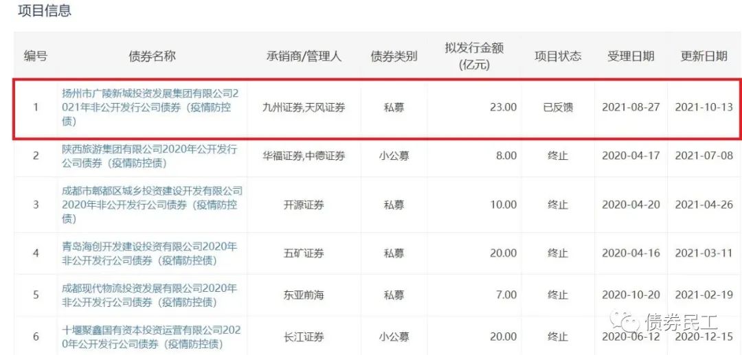 2021年至今,在深交所申報的疫情防控債只有揚州市廣陵新城投資發(fā)展集團有限公司2021年非公開發(fā)行公司債券(疫情防控債)一只債券,擬發(fā)行金額為23億元。深交所在2021年沒有核準疫情防控債的通過債券批文。