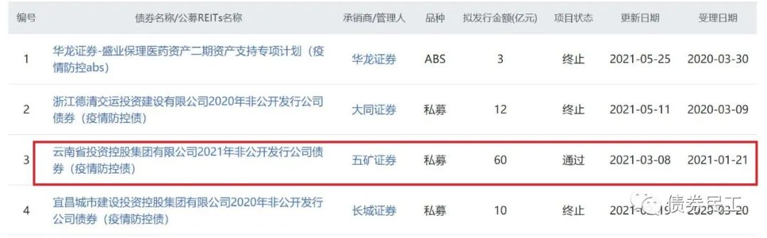 不只是在債券一級發(fā)行方面,在債券申報方面,疫情防控債也失去了吸引力。2021年至今,上交所審核通過的疫情防控債只有云南省投資控股集團有限公司2021年非公開發(fā)行公司債券(疫情防控債)一只債券,擬發(fā)行金額為60億元,其余三只債券產(chǎn)品和ABS產(chǎn)品均終止。但是上述債券批文在2021年暫未發(fā)行。