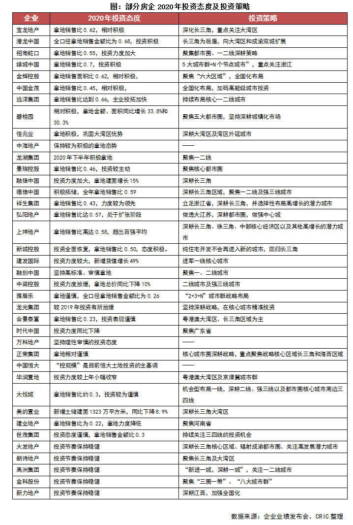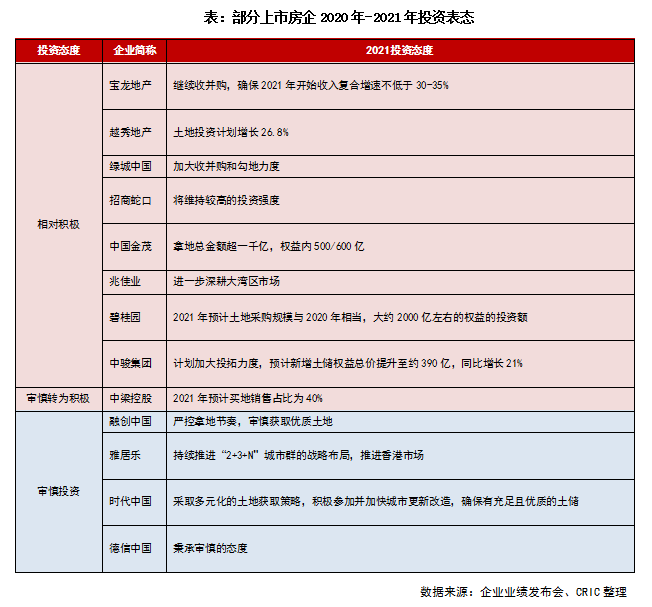 一季度末上市房企陸續公布了2020年成績單,業績會上部分房企透露了今年的銷售目標和市場判斷,這無疑對未來企業投資策略產生巨大影響。整體而言,謹慎投資仍是主旋律,區域選擇仍聚焦長三角和粵港澳大灣區,且在22城集中供地之下,普遍認為提升投資質量、拓寬投資渠道是突圍的核心競爭力。