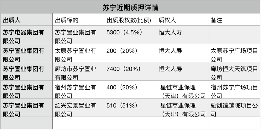 同時,蘇寧置業也將太原蘇寧置業、廊坊蘇寧置業20%的股權質押給恒大人壽,這兩家公司擁有正在開發中蘇寧廣場。