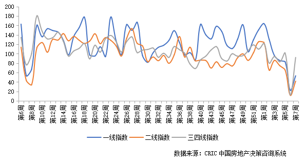 2022年第7周成交低位回升。一線城市成交指數為53.22,環比增長30.76點;二線城市成交指數為41.82,環比增長30.00點;三四線城市成交指數為92.07,環比增長79.19點。
