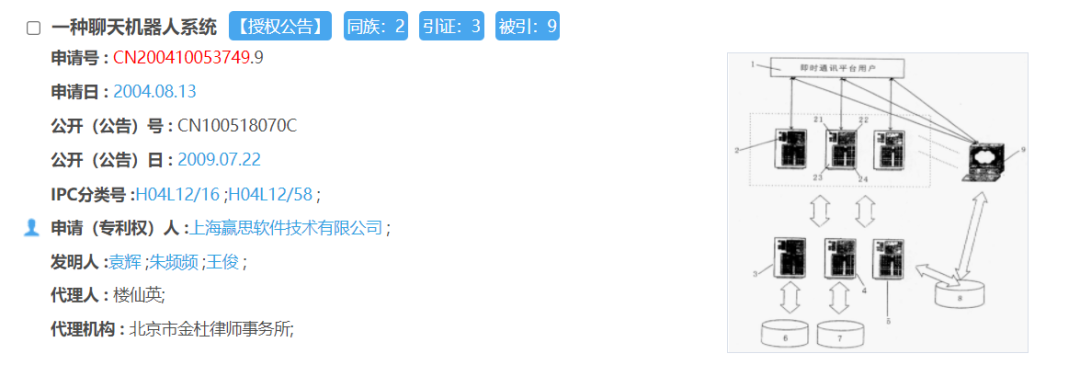 據了解,小i機器人隸屬上海智臻智能網絡科技股份有限公司,而上述“ZL200410053749.9”這一編號則是名為“一種聊天機器人系統”的專利。
