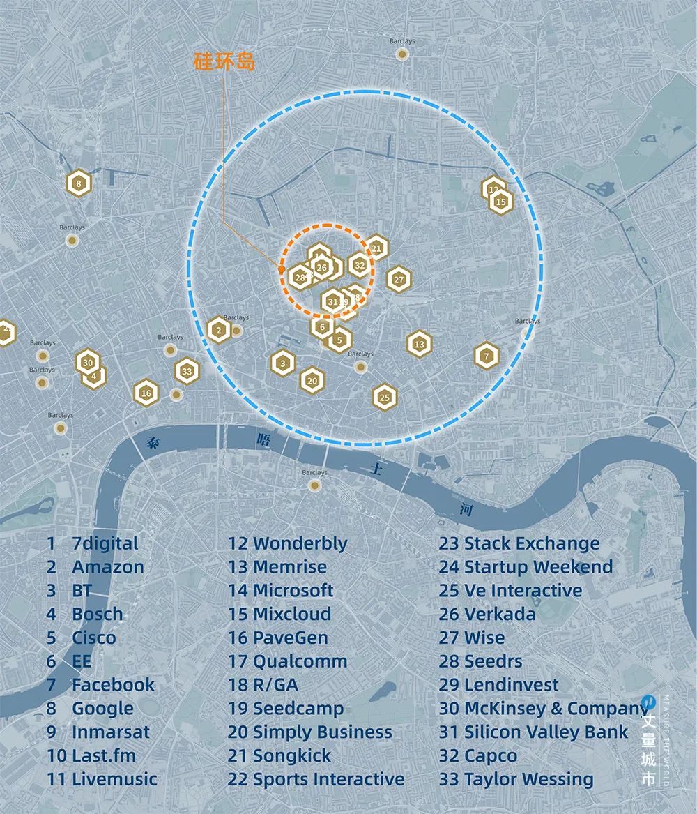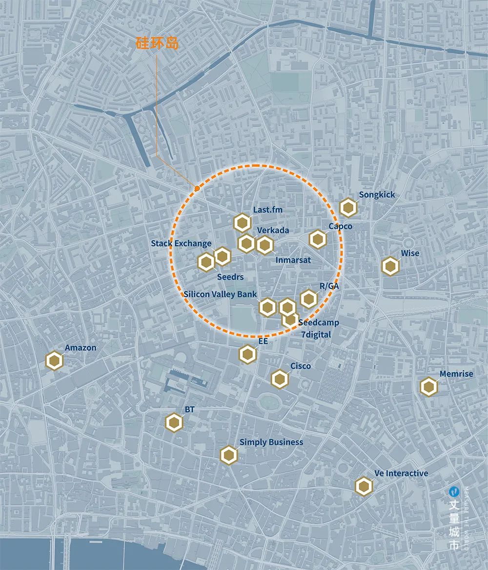 直到1990年代,實(shí)施至今的三輪更新,才扭轉(zhuǎn)區(qū)域的命運(yùn)。如今這里已是英國(guó)科技企業(yè)最密集(已超過(guò)1600家)、全球人才密度最高的創(chuàng)新區(qū)。