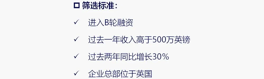 成長(zhǎng)企業(yè):進(jìn)入該階段的企業(yè)會(huì)進(jìn)入「未來(lái)五十」計(jì)劃階段,未來(lái)五十指:扶持在英國(guó)進(jìn)入B輪融資發(fā)展最快的50家科創(chuàng)企業(yè),英國(guó)政府每年為企業(yè)量身定制扶植計(jì)劃,幫助其發(fā)展。