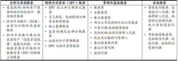 “備位服務”作為資產證券化運營風險管理的重要一環,防范的是初始資產服務機構經營不善、破產等原因導致資產服務中斷的極端風險。雖然發生的概率極低,但一旦發生,影響極大,所以越來越引起市場參與者的重視。不過正是由于發生的概率極低,“備位服務”很難獨立成為一種商業模式。國際證券化市場中,備位服務機構同時也是資產服務機構,另外也提供其他相關的證券化服務。以意大利證券化綜合服務商Securitisation Services公司為例,其2001年起成為證券化服務商,如今提供證券化“一站式”(One-stop-shop)綜合服務,詳見下表四,涵蓋多種服務范圍,管理資產規模超過2,950億歐元,服務證券化交易超過360單,涉及1040多個角色、超過15個資產類別、250多家SPV,公司人數超過155人。2007年首次獲得標普服務商評級“強(Strong)”級別,2012年起至2020年連續多年獲得標普服務商多項評級“強(Strong)”級別,包括意大利ABS主服務商、RMBS和CMBS主服務商綜合評級、公司管理和組織架構單項評級、資產管理能力單項評級均為“強(Strong)”級別,展望“穩定(Stable)” ④,成為歐洲市場領先的資產服務商和備位服務機構。