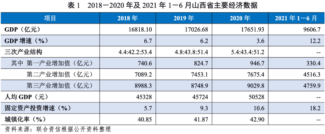 山西省自然資源稟賦良好,近年來經(jīng)濟(jì)穩(wěn)步發(fā)展,整體經(jīng)濟(jì)發(fā)展水平處于全國下游,經(jīng)濟(jì)總量及人均GDP在全國排名靠后。受新冠疫情影響,2020年山西省地區(qū)生產(chǎn)總值增速同比有所下降。2018-2020年,山西省第二產(chǎn)業(yè)占比波動(dòng)上升,對(duì)煤炭產(chǎn)業(yè)依賴性強(qiáng),在碳達(dá)峰和碳中和目標(biāo)的背景下,山西省面臨較大的產(chǎn)業(yè)升級(jí)和結(jié)構(gòu)調(diào)整壓力。2020年,山西省一般公共預(yù)算收入規(guī)模在全國排名第16位,稅收占比較高但財(cái)政自給程度一般,中央補(bǔ)助規(guī)模大且持續(xù)性好。2020年山西省政府負(fù)債率為26.13%,政府債務(wù)負(fù)擔(dān)較輕;山西省政府債務(wù)率為78.17%,償債能力較強(qiáng)。