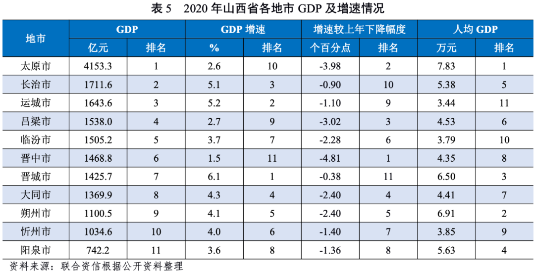 從經(jīng)濟(jì)增速看,2020年山西省各地市經(jīng)濟(jì)均保持增長態(tài)勢(shì),但受新冠疫情影響,增速均有所下降,下降幅度排名前三名分別為晉中市、太原市和呂梁市;其中晉城市GDP增速位居省內(nèi)第一位,GDP增速下降幅度最小。太原市、呂梁市和晉中市增速低于全省平均水平(3.6%),其他地市GDP增速均超過全省平均水平。