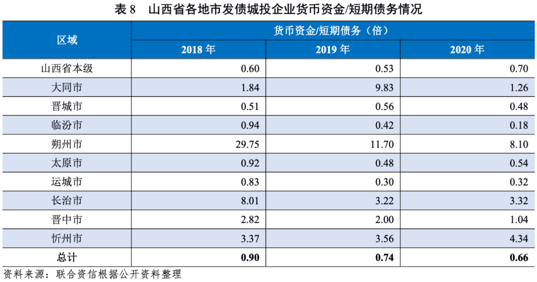 山西省大部分地市發(fā)債城投企業(yè)整體債務(wù)負(fù)擔(dān)較輕,由于購建固定資產(chǎn)和支付其他與投資有關(guān)的現(xiàn)金增加導(dǎo)致貨幣資金減少,各地市發(fā)債城投企業(yè)的短期償債能力指標(biāo)多有所弱化;山西省各地市綜合財(cái)力對(duì)城投企業(yè)2022年到期債券的覆蓋能力較強(qiáng),山西省各地市集中償付壓力較小。