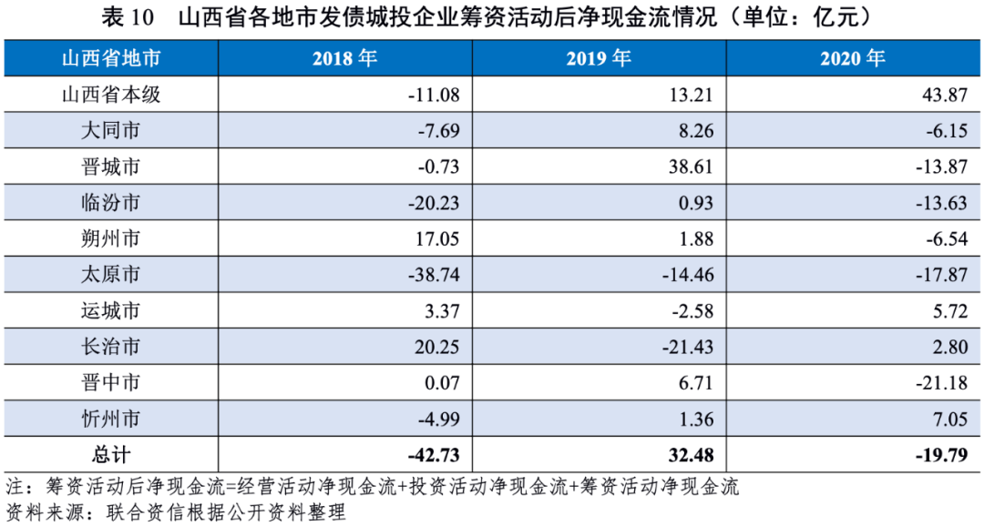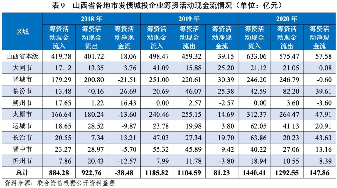 從籌資活動(dòng)現(xiàn)金流狀況來看,2018-2020年,山西省城投企業(yè)籌資活動(dòng)現(xiàn)金轉(zhuǎn)為凈流入且流入規(guī)模有所擴(kuò)大。由于臨汾市城投企業(yè)業(yè)務(wù)回款和收到的往來款較多,債務(wù)償還多依賴經(jīng)營性現(xiàn)金流,2018-2020年,臨汾市城投企業(yè)籌資活動(dòng)現(xiàn)金持續(xù)凈流出。2020年,山西省發(fā)債城投企業(yè)籌資活動(dòng)現(xiàn)金流較2019年普遍改善,主要由于融資環(huán)境相對(duì)寬松。除臨汾市、朔州市和晉城市外,山西省2020年發(fā)債城投企業(yè)籌資活動(dòng)現(xiàn)金流均呈凈流入狀態(tài)。