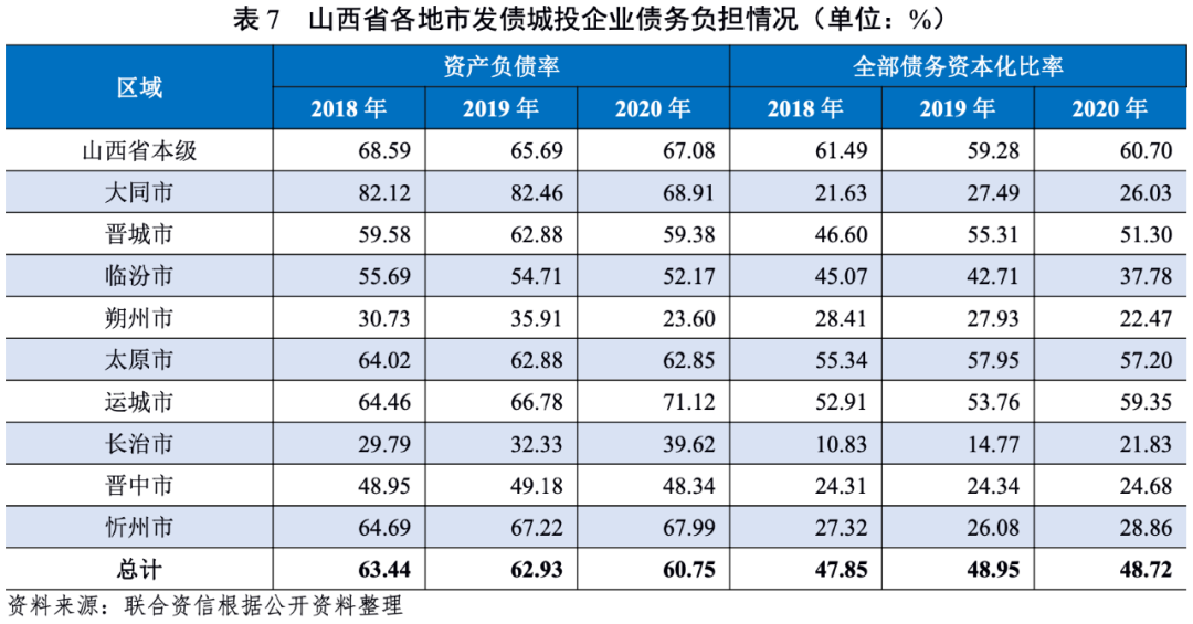 從債務(wù)負(fù)擔(dān)來看,2018-2020年,山西省城投企業(yè)資產(chǎn)負(fù)債率持續(xù)下降,全部債務(wù)資本化比率波動(dòng)上升。2020年底,山西省本級(jí)、大同市、太原市、運(yùn)城市和忻州市城投企業(yè)的資產(chǎn)負(fù)債率位居全省前列,均超過60%;山西省本級(jí)、晉城市、太原市和運(yùn)城市城投企業(yè)全部債務(wù)資本化比率位居全省前四,均超過50%;其他地市全部債務(wù)資本化比率處于較低水平。