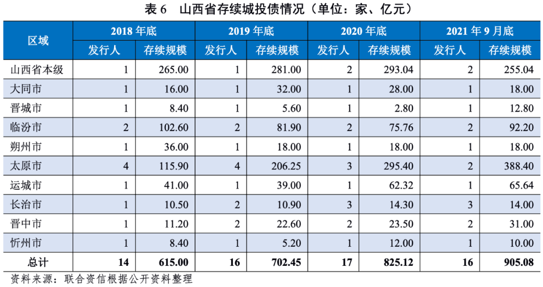 2018年至2021年9月底,山西省內(nèi)存續(xù)城投債規(guī)模持續(xù)上升,有存續(xù)債券的城投企業(yè)數(shù)量變化不大。截至2021年9月底,山西省存續(xù)城投債余額共計(jì)905.08億元,與其他省/直轄市的城投債余額相比金額較?。簧轿魇?nèi)有存續(xù)債券的城投企業(yè)共16家,以地級(jí)市城投企業(yè)為主,具體包括省本級(jí)企業(yè)2家,地級(jí)市企業(yè)11家、區(qū)縣級(jí)企業(yè)3家。其中,省本級(jí)和太原市存續(xù)的城投債余額相對(duì)較大,2021年9月底分別為255.04億元和388.40億元,合計(jì)占山西省存續(xù)城投債余額的71.09%;山西省下轄的陽泉市和呂梁市無存續(xù)城投債。