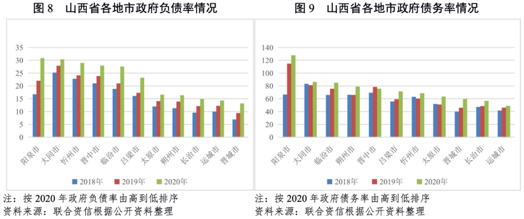 債務(wù)負(fù)擔(dān)方面,近年來山西省各地市負(fù)債率均持續(xù)上升。2020年,陽泉市、臨汾市和呂梁市政府負(fù)債率相對(duì)上升較快,分別較2019年上升8.82個(gè)百分點(diǎn)、6.62個(gè)百分點(diǎn)和5.93個(gè)百分點(diǎn)。總體看,山西省各地市債務(wù)負(fù)擔(dān)較輕。