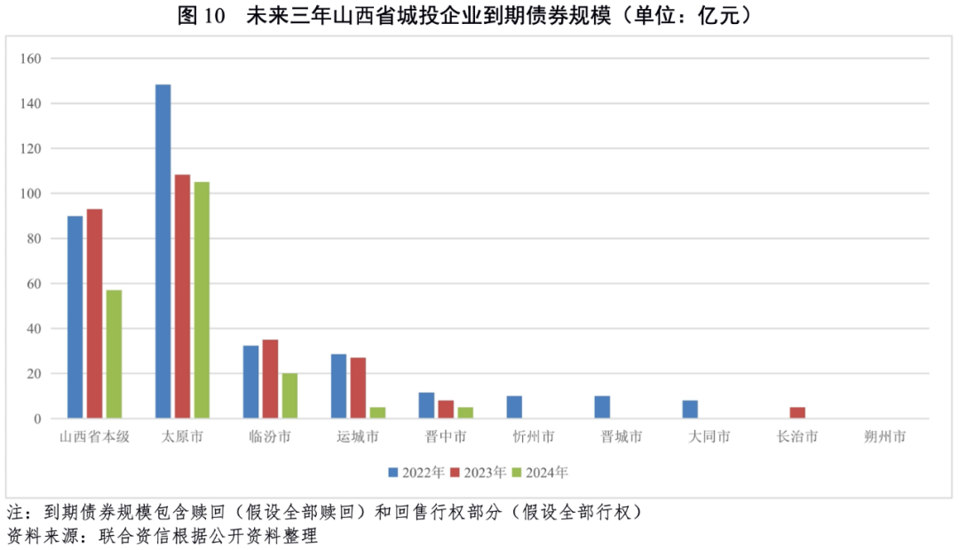 從山西省發(fā)債城投企業(yè)未來三年(2022-2024年)到期債券規(guī)???,太原市和山西省本級(jí)城投企業(yè)排名前兩位,到期債券三年合計(jì)分別為361.70億元和240.04億元;臨汾市和運(yùn)城市城投企業(yè)到期債券規(guī)模相對(duì)較大,合計(jì)均在50億元以上。2022年,山西省城投企業(yè)到期債券規(guī)模合計(jì)338.84億元,其中太原市和山西省本級(jí)城投企業(yè)到期債券規(guī)模較大,分別為148.40億元和89.94億元。
