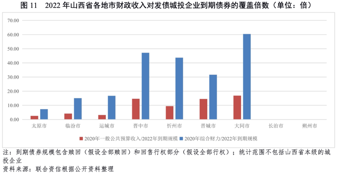 從地方一般公共預(yù)算收入對(duì)到期債券規(guī)模的覆蓋倍數(shù)來看,山西省各地市一般公共預(yù)算收入可以覆蓋當(dāng)?shù)爻峭镀髽I(yè)2022年到期債券,太原市覆蓋倍數(shù)最低,為2.55倍,長治市和朔州市2022年無到期債券??紤]到各地市能夠獲得的政府性基金收入及上級(jí)補(bǔ)助收入,從綜合財(cái)力對(duì)到期債券的覆蓋倍數(shù)來看,各地市綜合財(cái)力對(duì)當(dāng)?shù)爻峭镀髽I(yè)2022年到期債券的覆蓋倍數(shù)介于7.32倍至60.40倍之間??傮w看,山西省各地市綜合財(cái)力對(duì)城投企業(yè)2022年到期債券的覆蓋能力較強(qiáng),山西省各地市集中償付壓力較小。